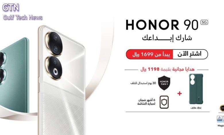 هاتف HONOR 90 5G متوفر الآن للطلب المسبق بسعر يبدأ من 1699 ريال سعودي لنسخة (8GB + 256GB) و2099 ريال سعودي لنسخة (12GB + 512GB) مع هدايا مجانية بقيمة 1327 ريال سعودي، تتضمن سماعات هدية، HONOR Care+، وهدايا أخرى.