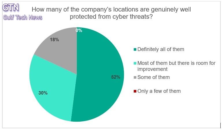 حسب التقرير، قال 52% من المشاركين في المملكة العربية السعودية أنهم واثقون من أن الحماية من التهديدات السيبرانية كانت متساوية بفعاليتها في كل من مكاتبهم الرئيسية والمكاتب المحلية.