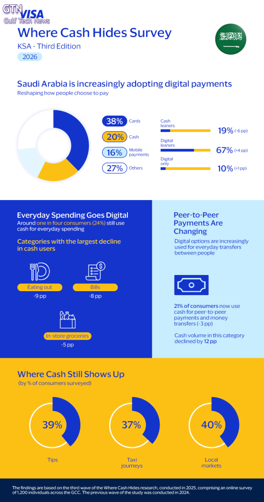 المدفوعات عبر الهاتف المحمول تتزايد بينما يواصل النقد تراجعه: تقرير Visa يسلّط الضوء على تغيّر أنماط الدفع في المملكة