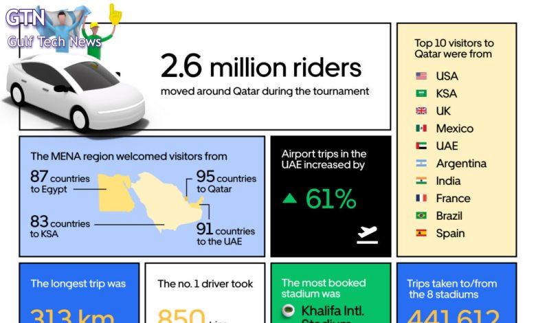 - 2,6 مليون راكب استخدموا تطبيق أوبر لطلب رحلات للتنقل في قطر خلال فترة البطولة، التي انطلقت قبل أربعة أسابيع، وساهمت أوبر في مساعدة قطر على تلبية الطلب غير المسبوق على وسائل النقل.