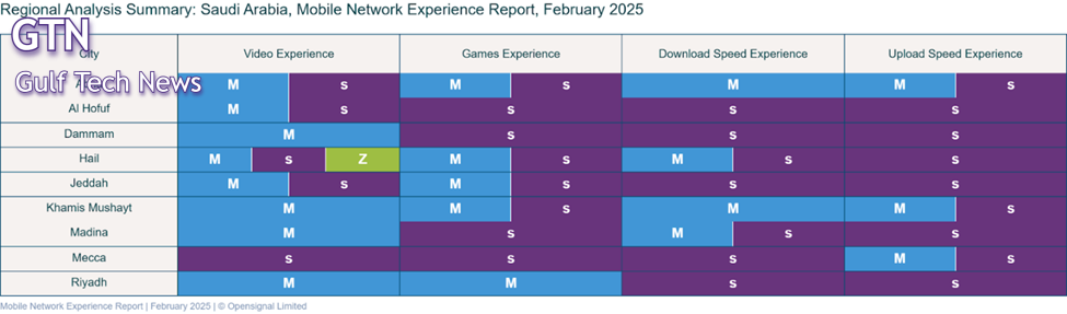 تُظهر شركة موبايلي أداءً قويًا في تجربة الفيديو عبر عدة مدن، بما في ذلك أبها، والهفوف، والدمام، وحائل، وجدة، وخميس مشيط، والمدينة المنورة، والرياض، بينما تراجعت شركة stc في هذه الفئة في معظم المناطق، وفيما يتعلق بتجربة الألعاب، تهيمن موبايلي أيضًا على عدة مدن، في حين تُظهر stc أداءً أقل.