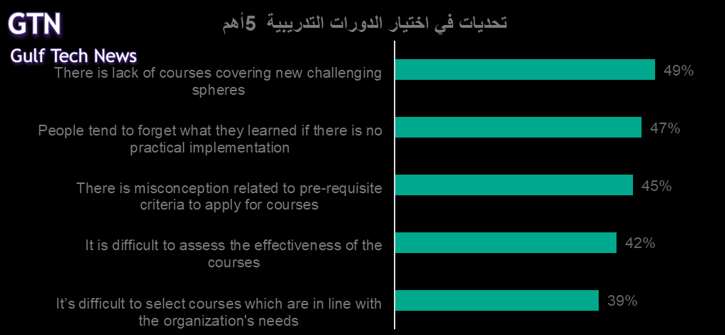كما ذكر 47%من المشاركين (50% في الشرق الأوسط وتركيا وإفريقيا) أن المتدربين يميلون إلى نسيان ما تعلموه، لأنهم لم يحصلوا على فرصة لتطبيق المعرفة المكتسبة حديثاً، وهو ما جعل الدورات عديمة الفائدة بالنسبة لهم. وكانت الحاجة إلى متطلبات تدريب خاصة مثل البرمجة والرياضيات المتقدمة – والتي لم يتم تحديدها في مرحلة التسجيل المسبق – مشكلة لحوالي 45% من الممارسين (37% منهم في الشرق الأوسط وتركيا وإفريقيا).