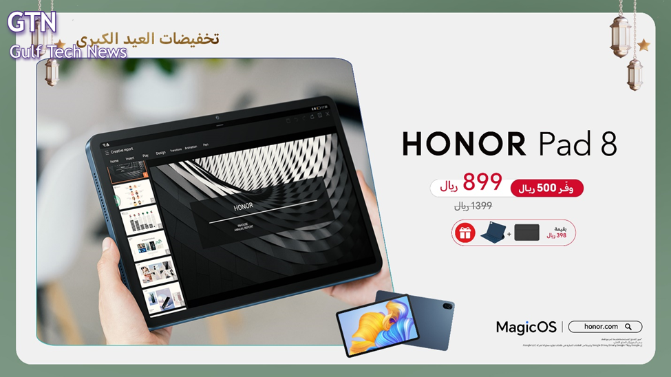 يأتي HONOR Pad 8 بسعر خاص 899 ريال بدلاً من 1399 ريال مع خصم 500 ريال خلال عروض العيد. عند الشراء، سيحصل المستهلكون على هدايا مجانية بقيمة 398 ريال تشمل غطاء الجهاز اللوحي ولوحة المفاتيح.