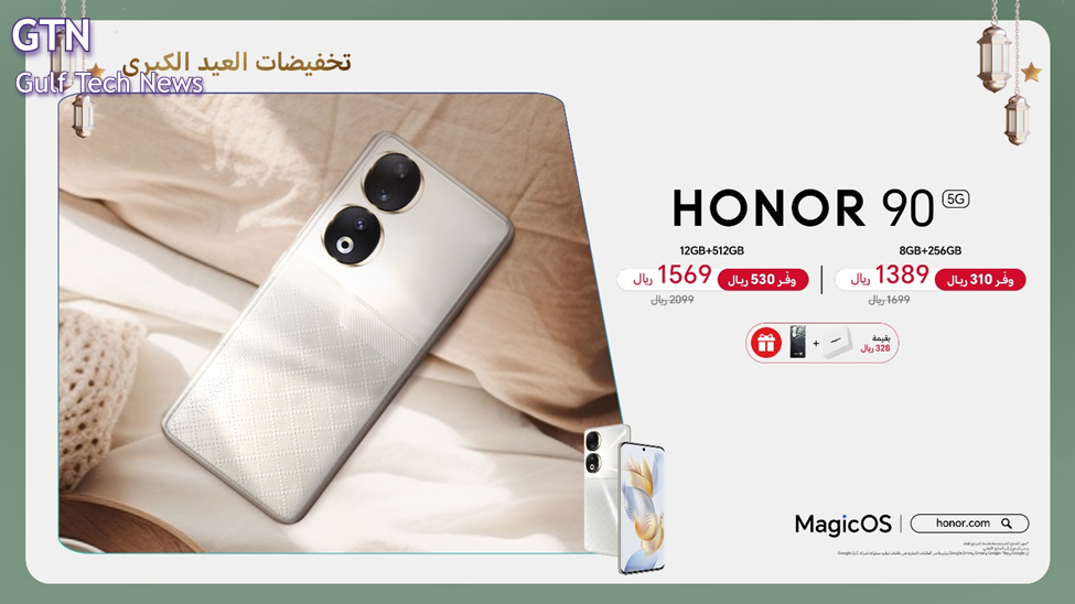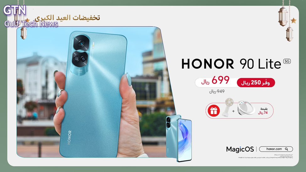 ويأتي هاتف HONOR 90 Lite 5G بسعر خاص 699 ريال بدلاً من 949 ريال خلال عروض العيد مع هدايا مجانية.