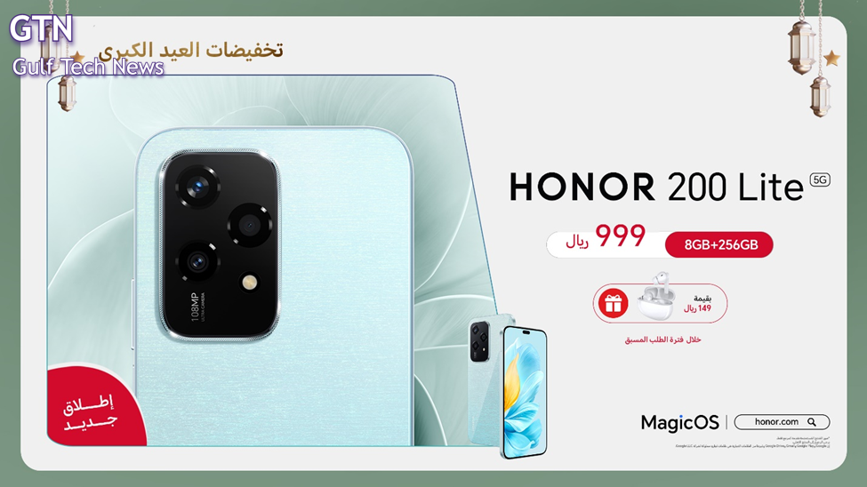 ويتوفر هاتف HONOR 200 Lite الجديد كلياً بسعر رائع مقابل 999 ريال مع سماعات أذن مجانية بقيمة 149 ريال خلال فترة الطلب المسبق.