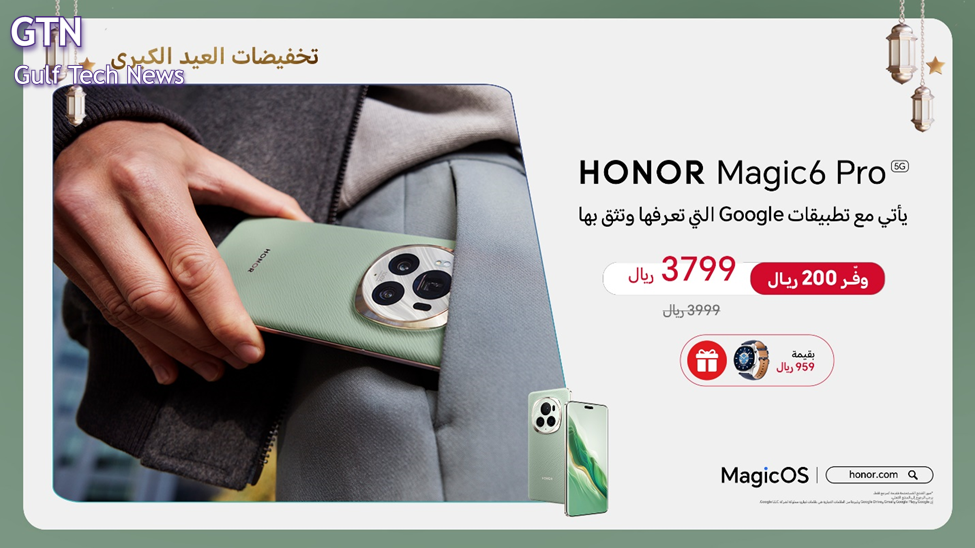 خلال عرض العيد، يتوفر هاتف HONOR Magic 6 Pro بسعر 3799 ريال بدلاً من 3999 ريال مع خصم 200 ريال. عند الشراء، سيحصل المستهلكون على ساعة HONOR Watch GS3 مجانًا بقيمة 959 ريال.