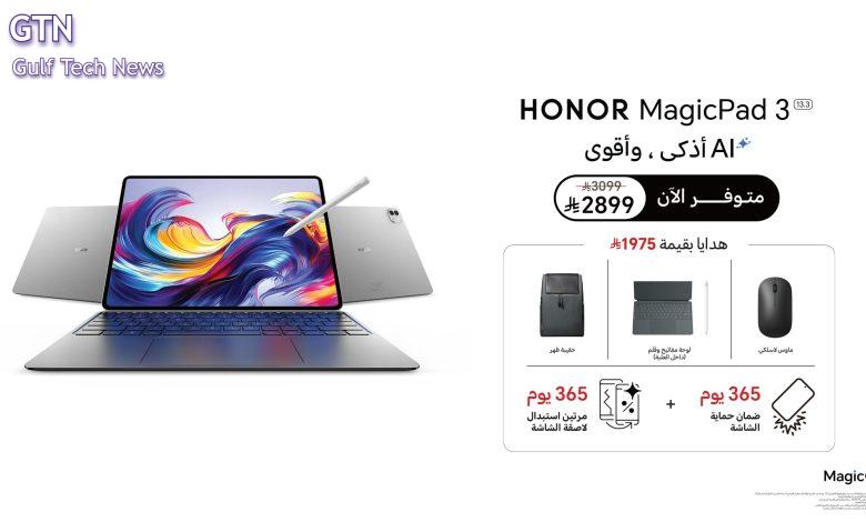 يتوفر جهاز HONOR MagicPad 3 باللون الرمادي بسعر 2,899 ريال سعودي. مع كل عملية شراء، سيحصل العملاء على هدايا مجانية بقيمة 1,975 ريال سعودي، تشمل ماوس لاسلكي، وقلمًا إلكترونيًا، ولوحة مفاتيح، وخدمة HONOR Care+ (ضمان حماية الشاشة لمدة 365 يومًا مع استبدال غشاء الشاشة مرتين خلال 12 شهرًا)، وحقيبة ظهر.