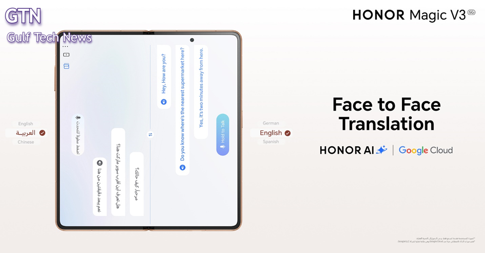 من الاستخدامات الواقعية الأخرى للذكاء الاصطناعي هي ميزة “Face-to-Face Translation”، التي تحول هاتفك الذكي إلى أداة اتصال سلسة. يستطيع HONOR Magic V3 توفير الترجمة للمحادثات الشخصية بسلاسة، سواء كان مطوياً أو مفتوحاً. يتيح ذلك للمستخدمين التواصل بسهولة عبر مجموعة متنوعة من اللغات، مما يحسن من تجربة السفر بشكل كبير.