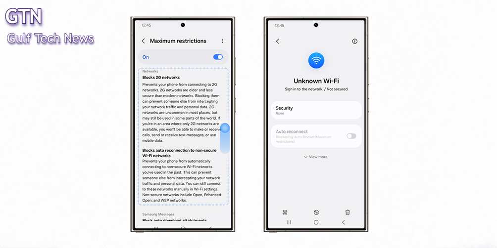 Maximum Restrictions establishes a powerful line of defense against today’s cyber threats. One UI 7 further enhances user choice with new features designed to protect those who may need additional safeguards. Maximum Restrictions has been updated with added controls for network connections so users can enjoy the peace of mind that comes from boosted protection without losing access to key device functionalities. Thanks to the added controls, users have the choice to block 2G service and prevent data from being intercepted when connected to potentially unsafe networks. Users can also prevent unintended automatic reconnection to certain Wi-Fi networks[3] that may be less secure, ensuring data remains private while still having the option to connect manually if desired.